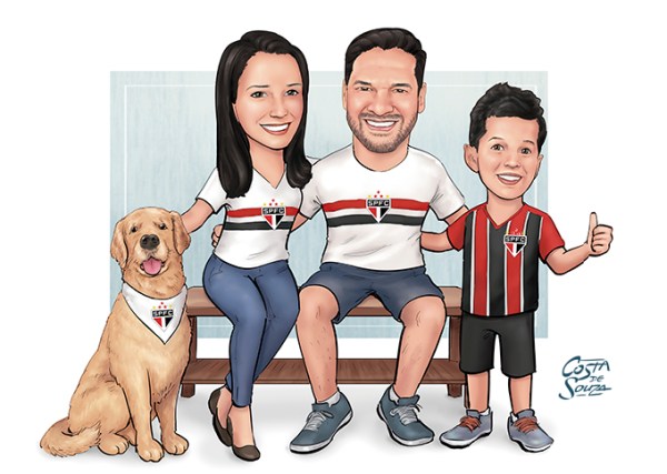 Caricatura de mãe, pai e filha para presente como post nas redes sociais e quadro em casa. Ele encomendou a caricatura da família para presentear no aniversário da esposa.