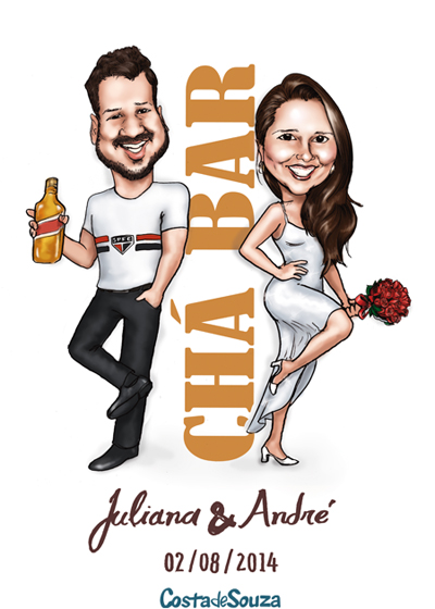 Chá Bar é uma ótima ocasião para utilizar a caricatura dos noivos, aproveitando o clima de humor e descontração da festa. A arte com caricatura do casal e a escrita de Chá Bar, nomes e data fica na opção Colorida, com 1 adicional. Entre em contato e peça um orçamento.