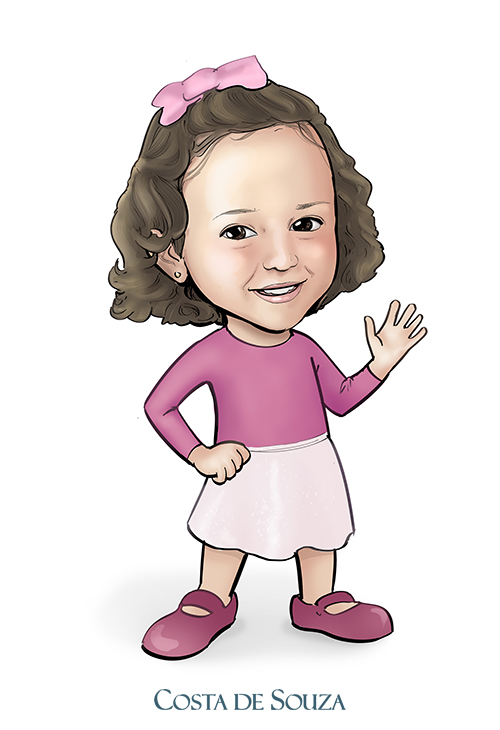 Caricatura por encomenda para homenagem com tema Arquearia. A pessoa homenageada já é adulta, mas o cliente pediu para que ela fosse representada a partir de fotos dela quando criança.