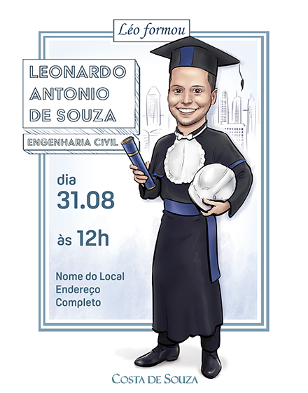 A caricatura para formatura pode ser utilizada no convite, como banner, quadro, display de mesa, totem e outros itens personalizados da festa.