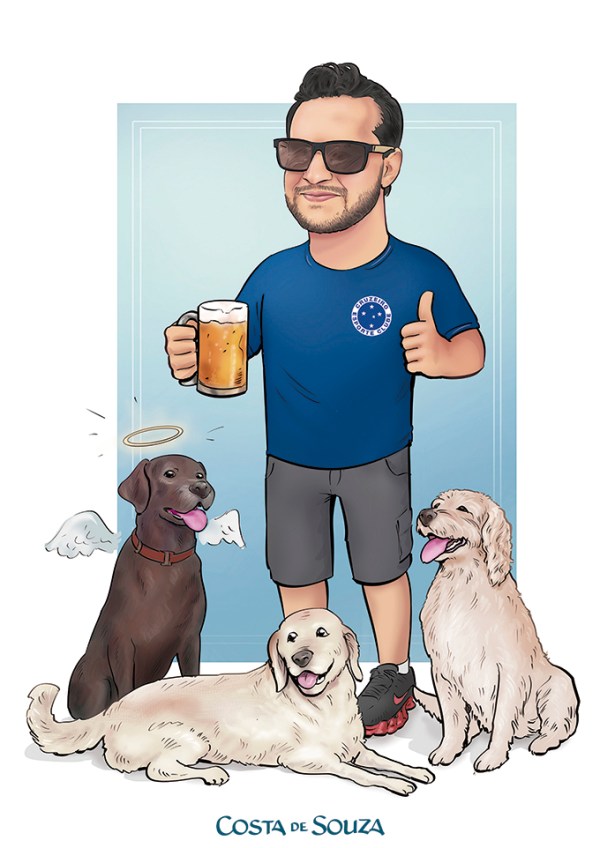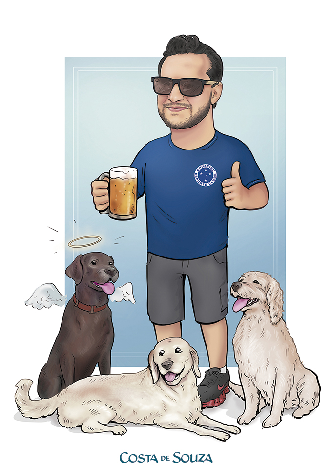 Caricatura digital por encomenda para presente como quadro. A cliente pediu que o homenageado estivesse junto dos seus 3 cachorros, inclusive um que infelizmente já se foi.