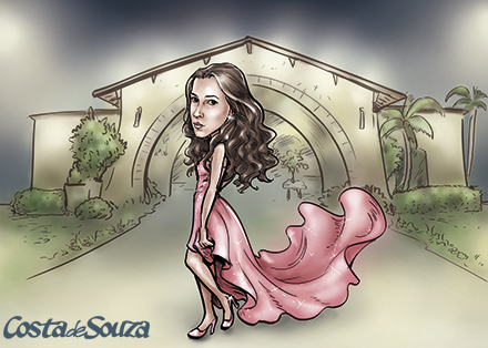 Caricatura para uso em decoração de baile de 15 anos. Opção Colorida, completa. Com o salão de festas ao fundo. Para quadro, totem, convite, lembranças e perfis pessoais de redes sociais.