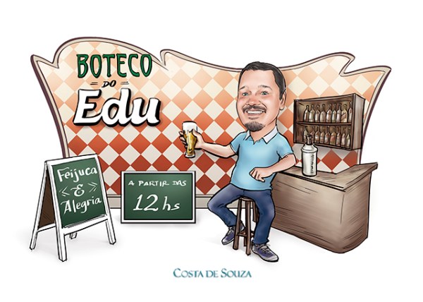 Caricatura para festa de aniversário com tema Boteco. Encomenda na opção Colorida, Completa.