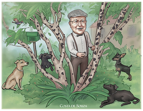 Caricature for a 40th birthday party with Feijoada theme. To be used as a banner and a framed picture in the party decor. Commission. Colorful, “Complete Scene” option.