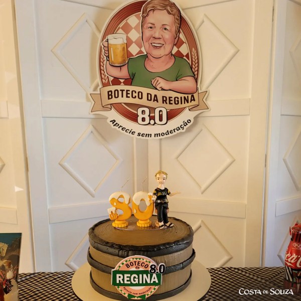 Caricatura para aniversário de 80 anos com tema Boteco. Encomenda na opção Colorida, completa, com design estilo rótulo de cerveja e também um desenho de convite completo, com todas as informações aos convidados.