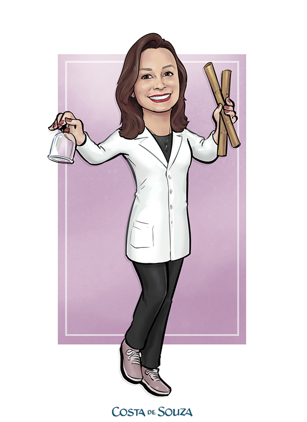 Caricatura de profissão para massoterapeuta e esteticista, para um quadro colocado na parede da clínica. Encomenda na opção Colorida, sem adicionais (Standard).