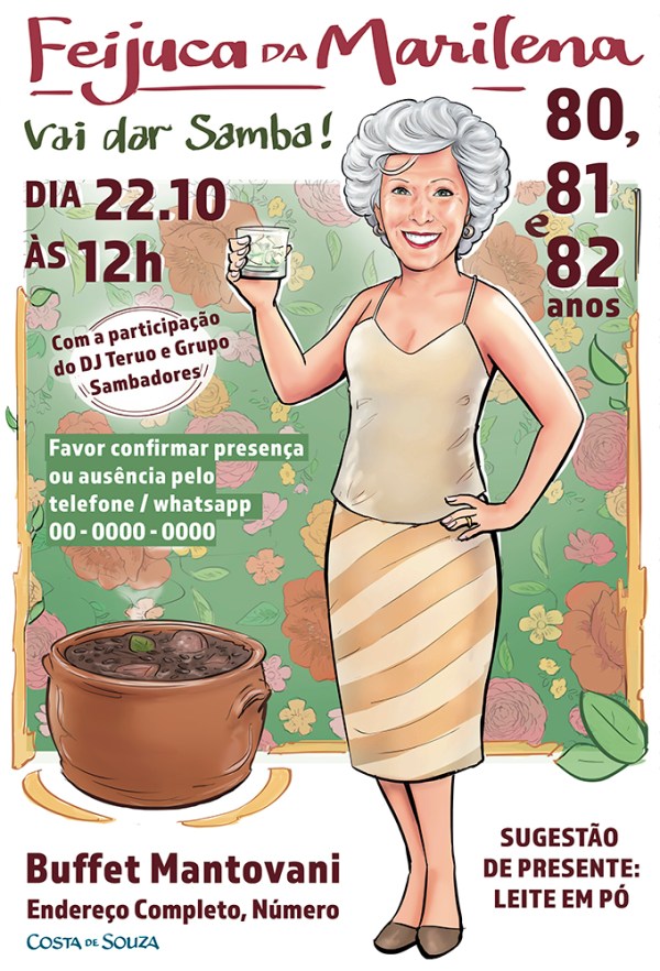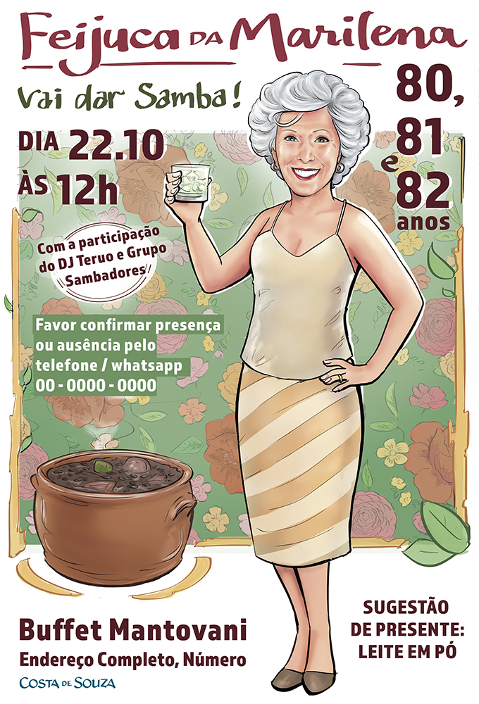 Caricatura e arte do convite para festa de aniversário com tema Feijoada. Esta foi uma festa especial que aconteceu logo após as restrições da pandemia, em 2022, por isso serviu para comemorar 80, 81 e 82 anos da aniversariante.