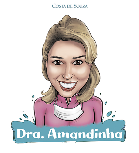 Caricatura and logotype for visual identitiy of the dentist Dra. Amandinha. She is a kid-focused dentist and asked for a bright coloured image showing her face alongside the name with a special lettering.