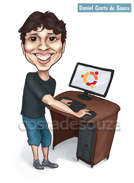 Caricatura para formatura em Sistemas de Informação. Formanda com livros, diploma, e cenário com tema Computação e números binários.