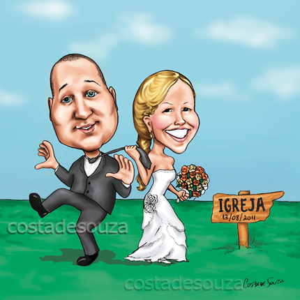 Caricatura dos noivos para animar o casamento e gravar o momento com arte e humor. Pode ser usada em convites, mural de assinatura, como quadro (impressa e emoldurada), estampada em objeto como lembrança, além de várias utilidades que a criatividade e a diversão permitirem. A encomenda acima foi para um casal de Blumenau.