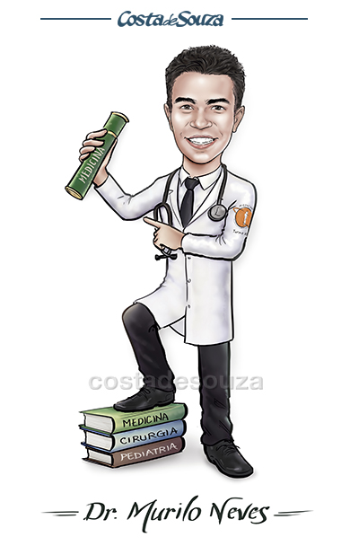 Caricatura para formatura de Medicina. Formando com diploma, estetoscópio e livros.