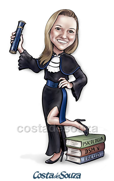 Caricatura para formatura de Psicologia. Formanda com diploma e livros.