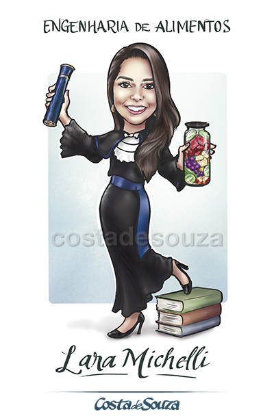 A caricatura para formatura pode ser utilizada como quadro, banner, totem em tamanho real, display de mesa e em produtos para os convidados como copos, taças e chinelos. É também uma forma criativa de ilustrar a conquista nos seus posts nas redes sociais.