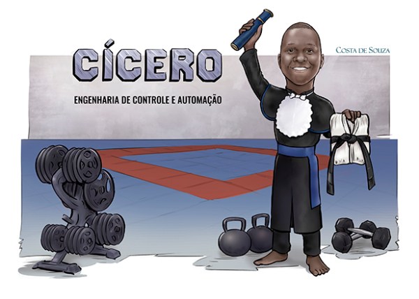 Caricatura para quadro de um casal da Dinamarca, pra celebrar a união dos dois. Eles são engenheiros. Ela trabalha com projetos relacionados a barragens e ele trabalha com energia renovável e adora andar de bicicleta. Um barco viking pra remeter à história e tradições dinamarquesas também foi incluído no cenário.