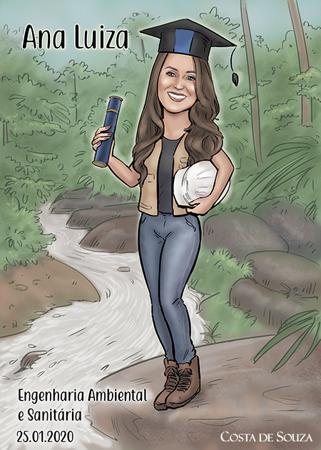 Caricatura para formatura em Engenharia Sanitária e Ambiental. Encomenda na opção “Colorida, completa”.