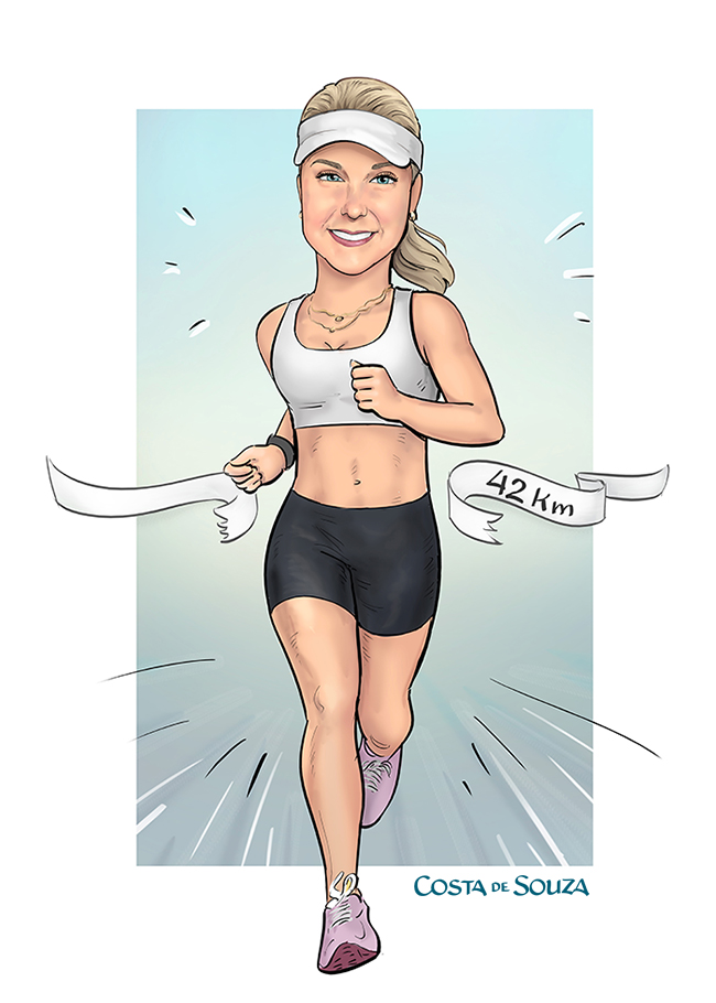 Caricatura para presente com tema Corrida. Encomenda na opção Colorida, com adicionais. Para uso como quadro, em porta-retrato e também digitalmente, nas redes sociais.