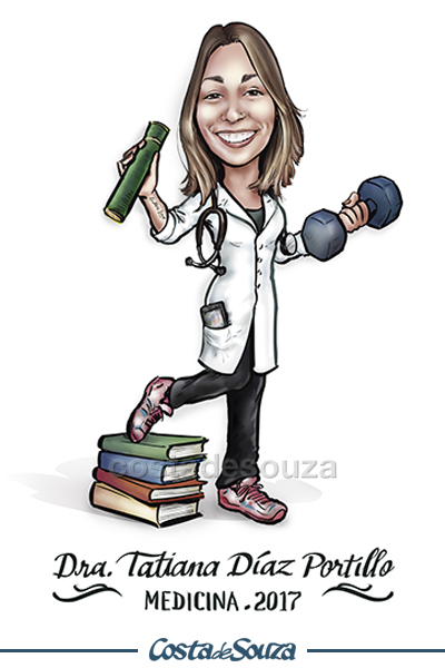 Caricatura para formatura de Medicina, para cliente do Uruguai. A formanda adora musculação e está sempre de olho no celular.