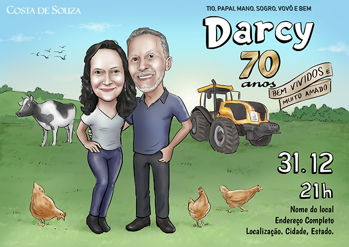 Caricatura para aniversário de 70 anos. A cliente pediu que a imagem mostrasse o aniversariante com sua companheira, na fazenda ao lado de um trator, vaca e galinhas.