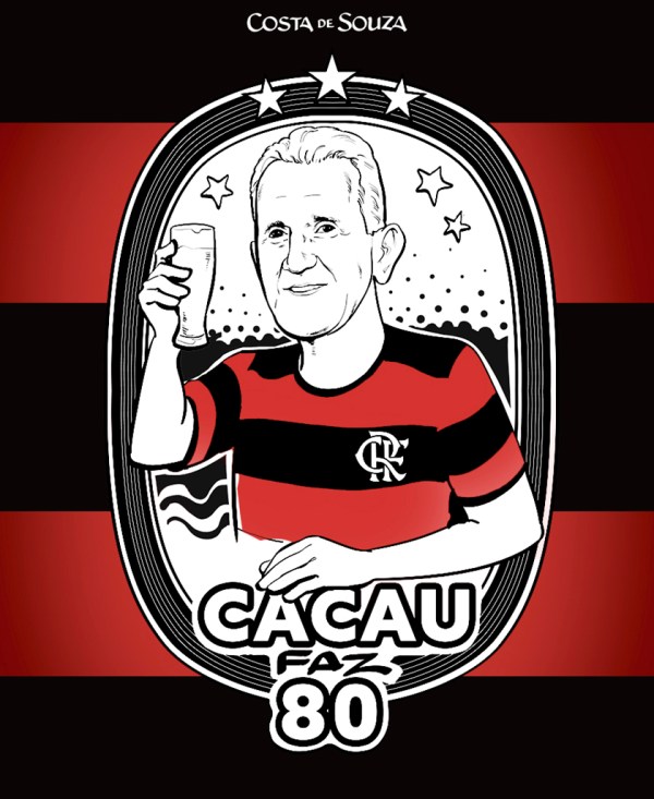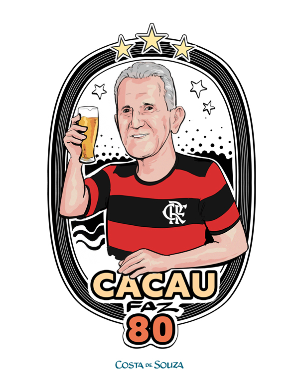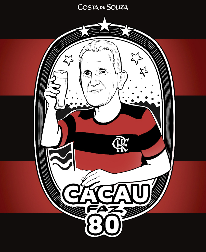 Caricatura para aniversário de 80 anos com tema Boteco e Flamengo, para aplicar em camisetas e copos personalizados da festa. Encomenda na opção Colorida, Completa.