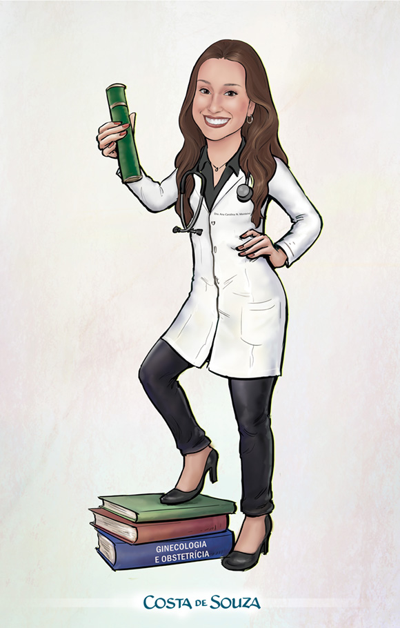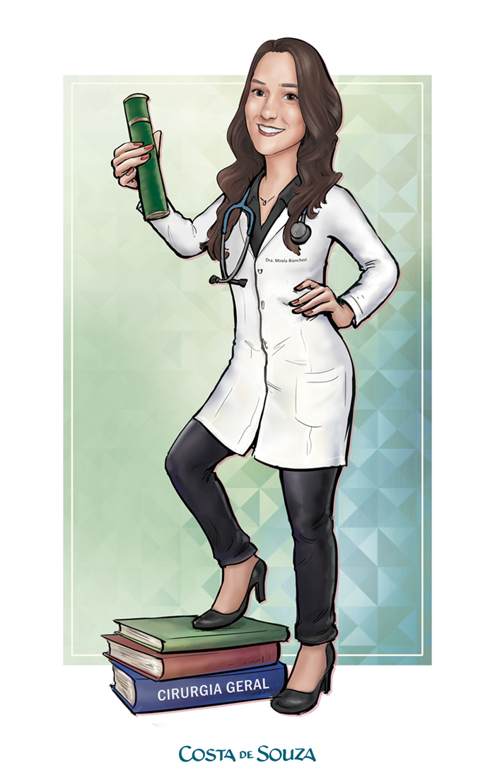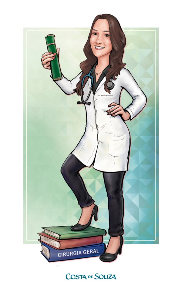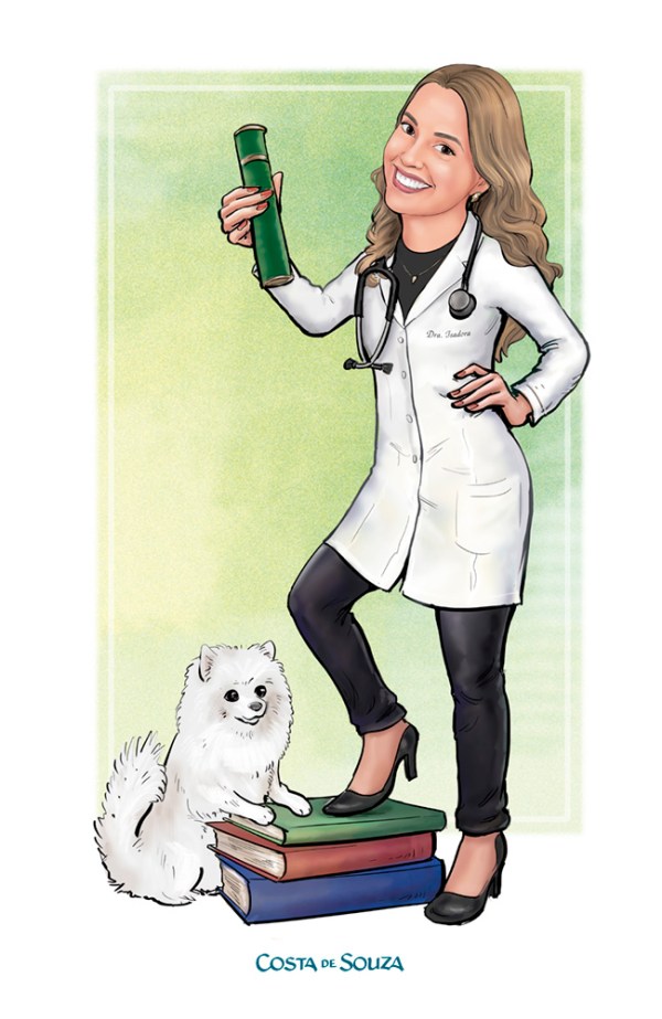 Caricatura para formatura de Medicina. Formanda de jaleco, estetoscópio, livros, e ao lado da sua cachorrinha.