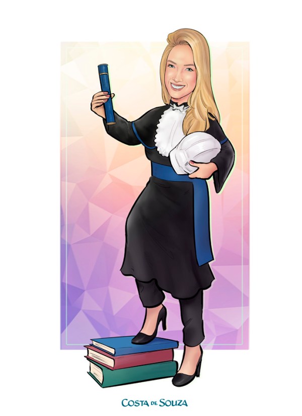 Caricatura para formatura de Medicina. Formanda com jaleco com escudo do Atlético-MG, livros e bandeira LGBTQIA+. O gato que a acompanhou nos estudos não poderia faltar no desenho.