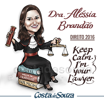 Caricatura para formatura de Direito. Formanda com balança, diploma, e livros em tamanho grande. Também foi desenvolvido um lettering com o nome da formanda, do curso e a frase “Keep calm, I´m your lawyer”.