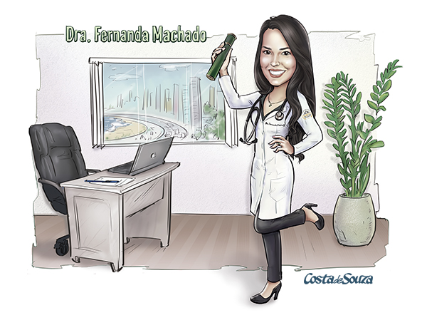 Caricatura para formatura de Medicina. Formanda no consultório, com cenário personalizado.
