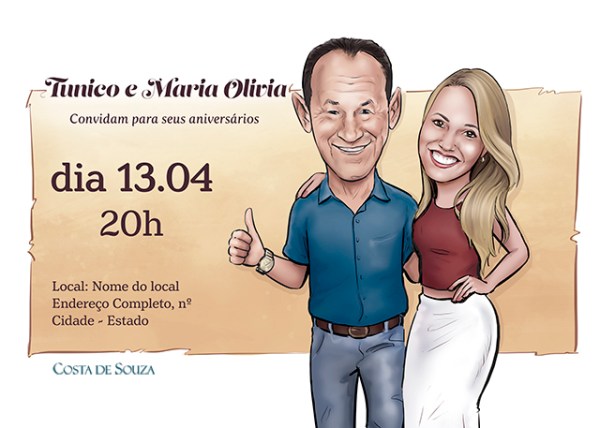 A caricatura para aniversário pode ser utilizada como convite, banner, quadro e aplicada em diversos itens personalizados da festa. É também uma forma divertida e criativa de marcar o momentos nas redes sociais.