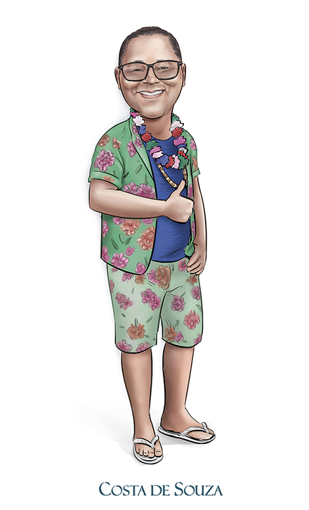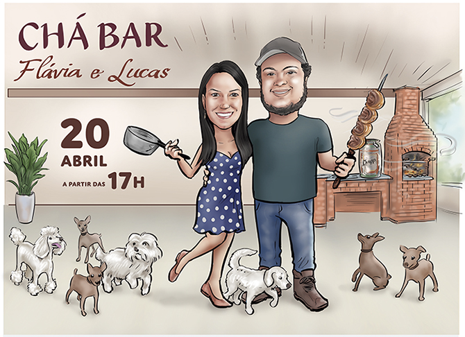Caricature for a 45th birthday party with Feijoada theme. Commission, “complete scene” option.