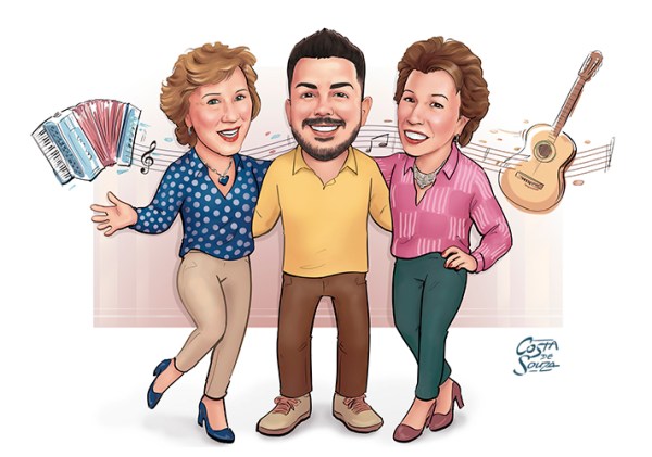 Nesta caricatura, a cliente pediu para o seu namorado (à esquerda) estar recebendo um bandolim entregue pelo ídolo Jacob do Bandolim, em meio a uma roda de choro. O homenageado tem ótimas referências culturais. No ano passado ele já tinha sido presenteado com esta caricatura inspirada na boemia parisiense.