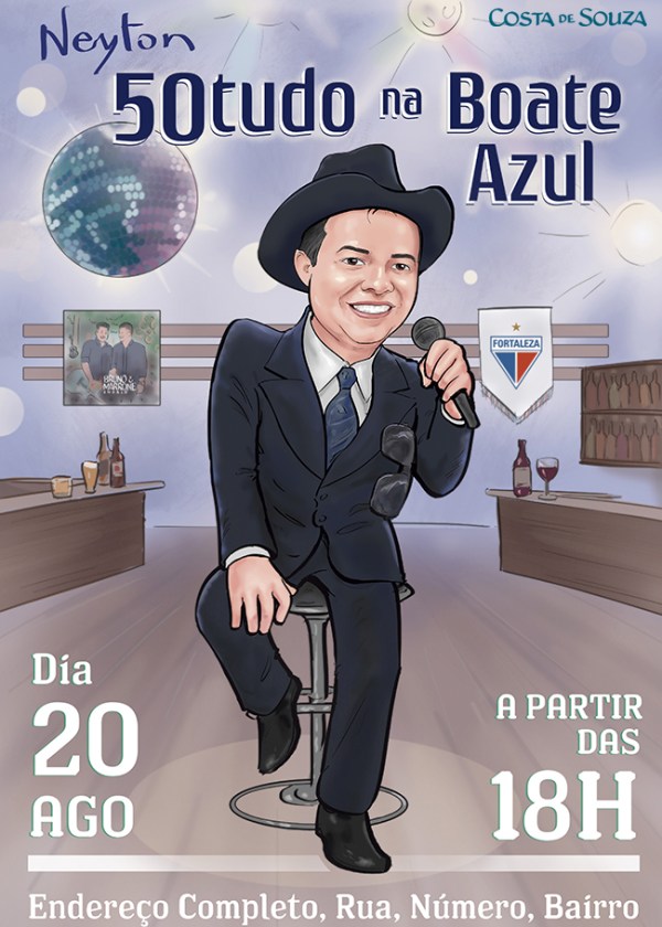 Caricatura para aniversário de 50 anos com tema Boate Azul e inspirada no cantor Waldick Soriano. O cliente pediu que o cenário representasse um bar em clima festivo.