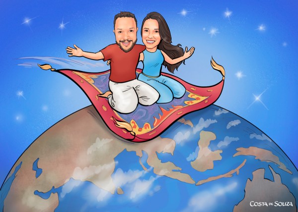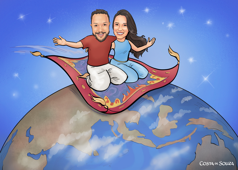O casal adora viajar e já visitou vários países da Ásia. Um amigo do casal pediu pra desenhá-los com o tema 1001 Noites, com um tapete voador.