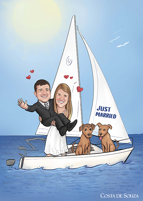 Caricatura de noivos para convite de casamento. Clientes pediram uma pose em que a noiva puxasse o noivo com uma corda, com ajuda do cachorro do casal. Encomenda na opção Colorida, com 1 adicional.