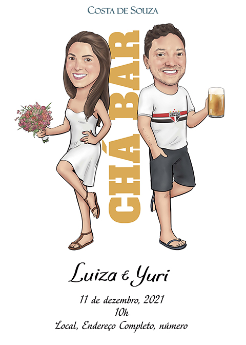 Couple caricature as bride and groom for a “Chá Bar”, a Brazilian traditional party that happens weeks before the wedding. Commission. Colorful, complete invitation design.