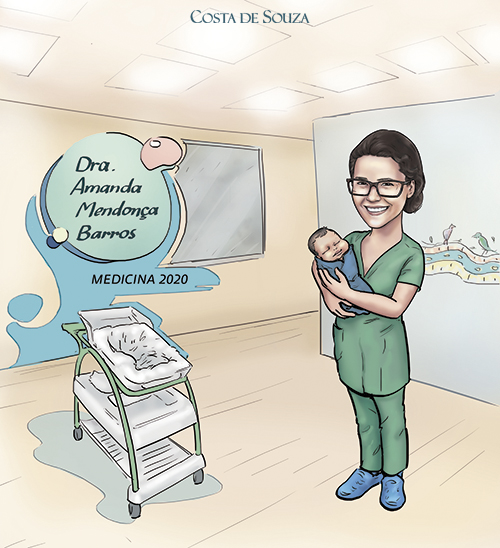 Caricatura para formatura de Medicina, para formanda que deseja se especializar em Pediatria. A cliente pediu que a caricatura fosse elaborada principalmente para aplicação em chinelos personalizados para presentear.