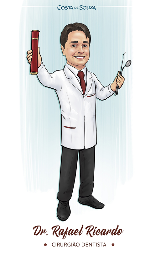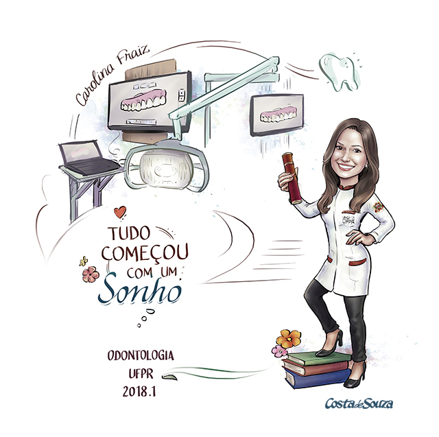Caricatura para formatura em Odontologia. Formando com diploma, instrumentos odontológicos, escrita de nome e nome do curso. Encomenda na opção “com 1 adicional”.