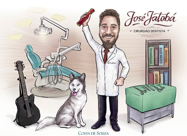 Caricatura para formatura em Odontologia. O formando adora tocar violão e pretende se especializar em cirurgia bucal. A cliente também pediu para incluir o cachorro dele e o nome do formando, com desenho personalizado das letras.
