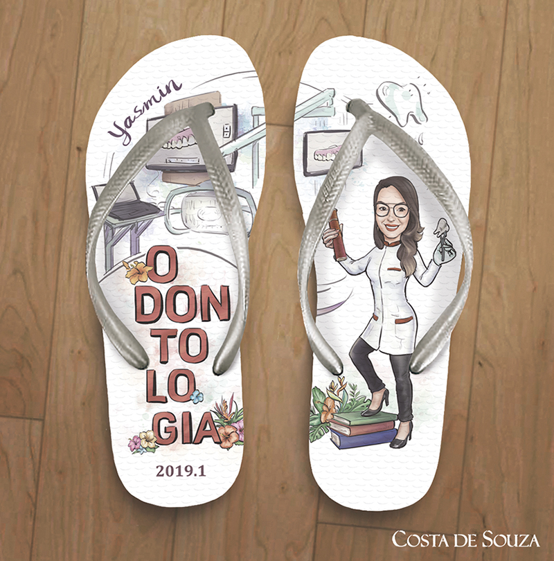 Caricatura para formatura de Odontologia, desenvolvida especialmente para a aplicação em chinelos personalizados entregues aos convidados da festa. A formanda pretende trabalhar com Odontologia Digital.