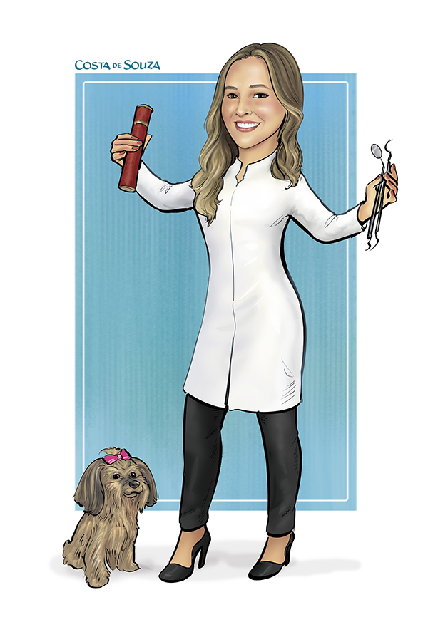 Caricatura para formatura em Odontologia. Encomenda na opção Colorida, com 1 adicional. O adicional nesse caso foi a cachorrinha ao lado da formanda no desenho.