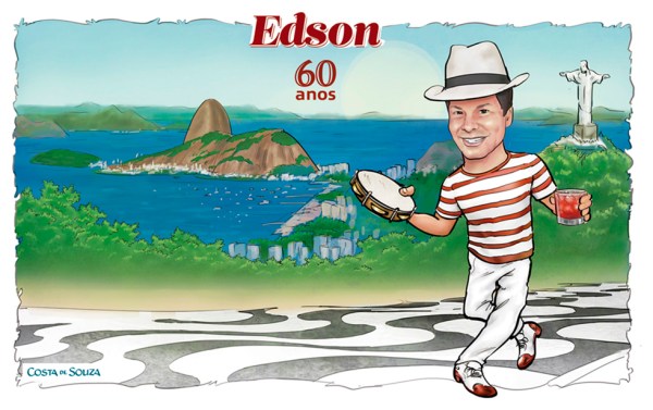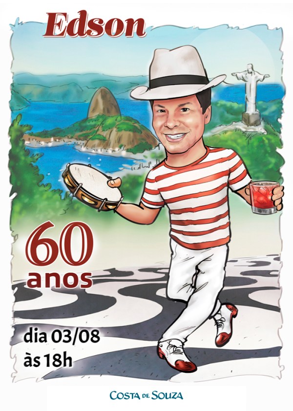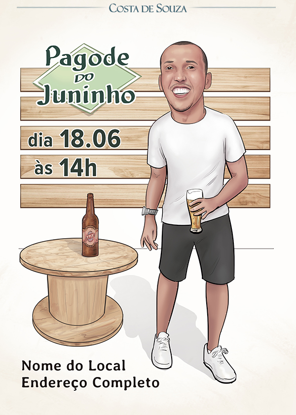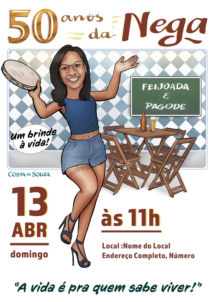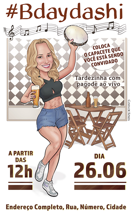 Caricatura e arte do convite para aniversário com tema Boteco e Pagode. Encomenda na opção Colorida, Completa.