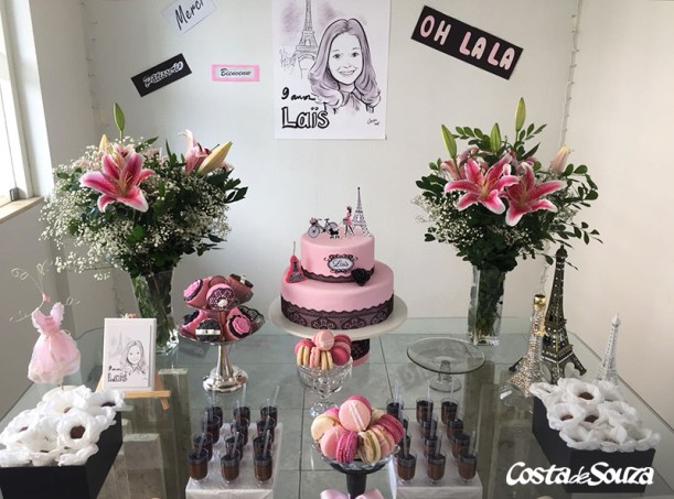 Caricatura para festa de aniversário de 9 anos com tema Paris. A cliente preparou uma decoração especial de Patisserie e queria uma imagem que remetesse às caricaturas de rua, dos artistas que desenham ao vivo nas praças.