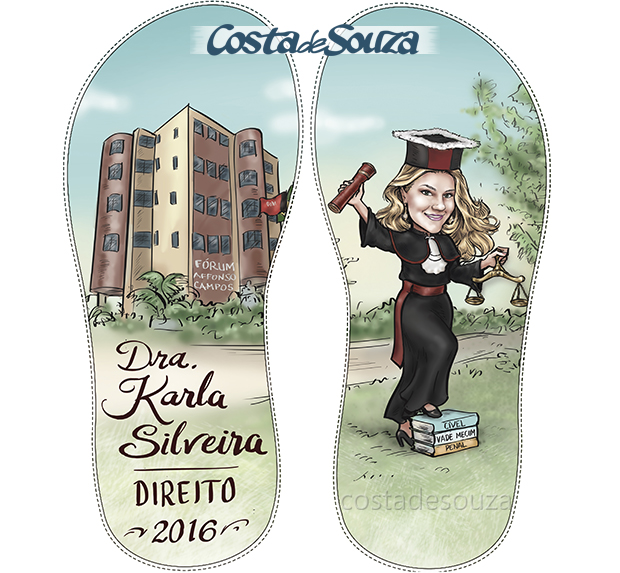 Como cenário, a cliente pediu para mostrar o Fórum Affonso Campos, de Campina Grande (PB). A arte completa também inclui o lettering com o nome da formanda, o curso e o ano. A composição da ilustração foi pensada para o recorte dos chinelos.