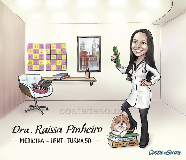 Caricatura por encomenda para formatura de Medicina. A formanda pretende se especializar em dermatologia e pediu para incluir no desenho a sua cachorrinha, um estojo de maquiagem, um ambiente de estudos e referência à cidade de Londres.