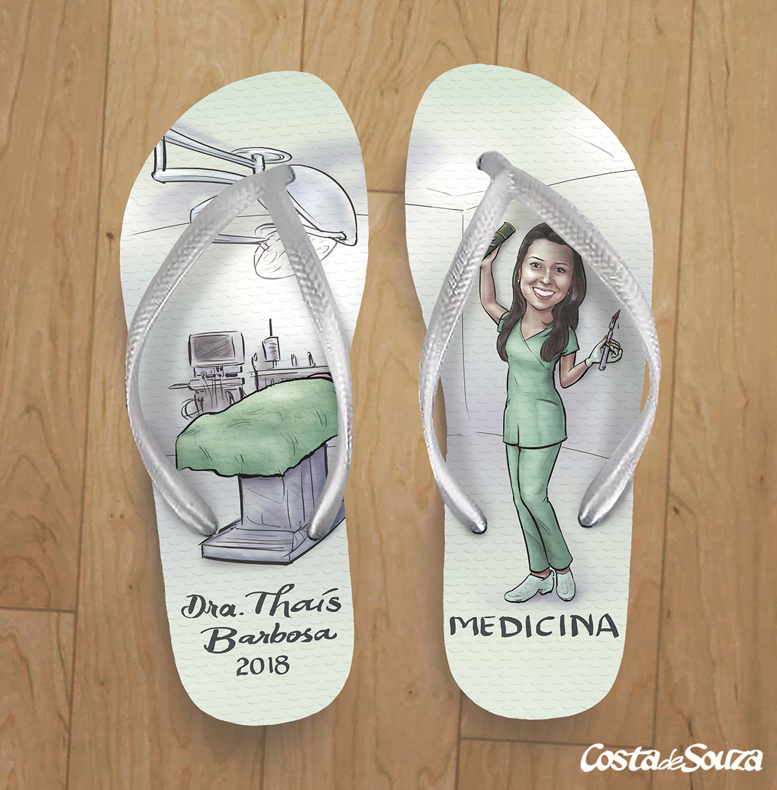 Caricatura para formatura de Medicina, com o desenho elaborado especialmente para o uso nos chinelos para presentear os convidados da festa. Encomenda na opção Colorida, Completa.