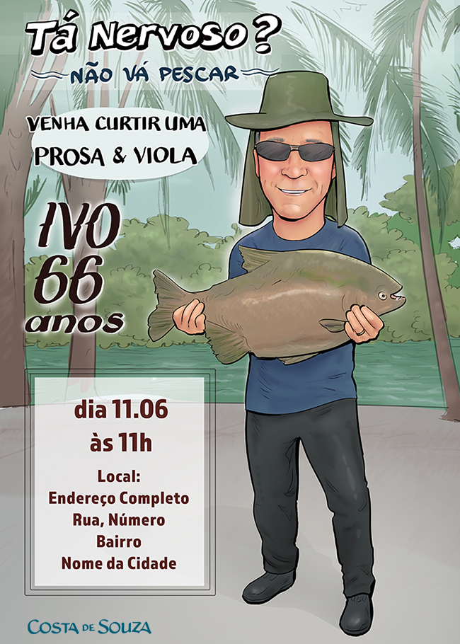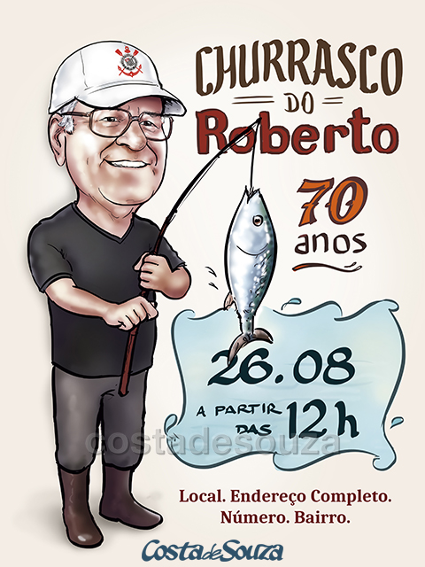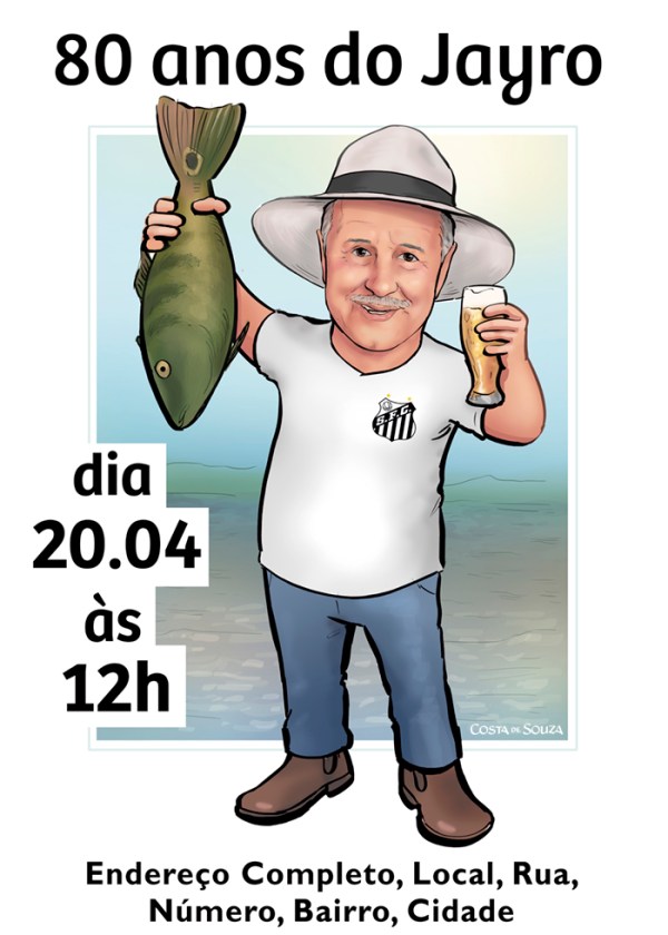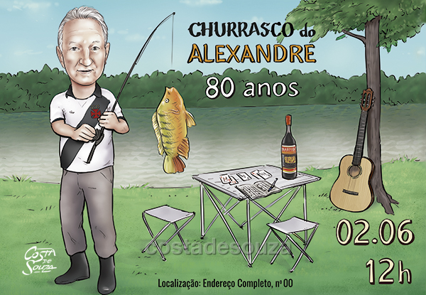 Caricatura e arte do convite para aniversário de 80 anos com tema Pesca. Encomenda na opção Colorida, Completa.