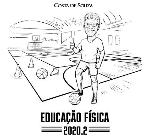 Caricatura para formatura em Educação Física. O formando em uma quadra escolar. Encomenda na opção “Em preto-e-branco”, completa.