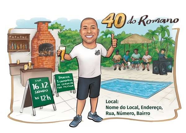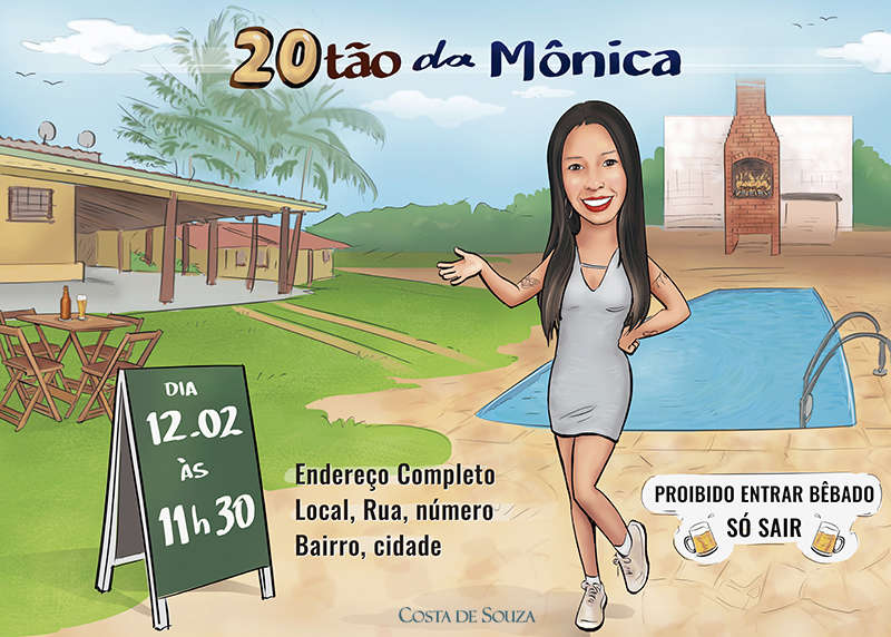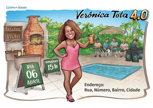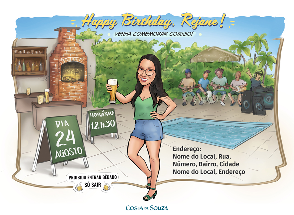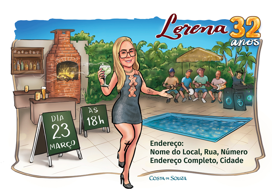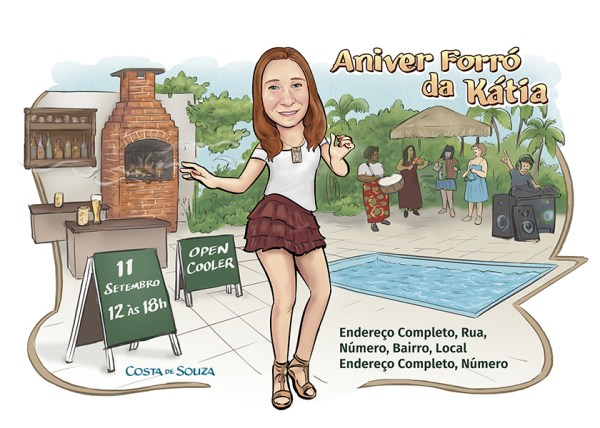 Caricatura e arte do convite para festa de aniversário com temas Piscina, Pagode e Churrasco. Encomenda na opção Colorida, Completa.