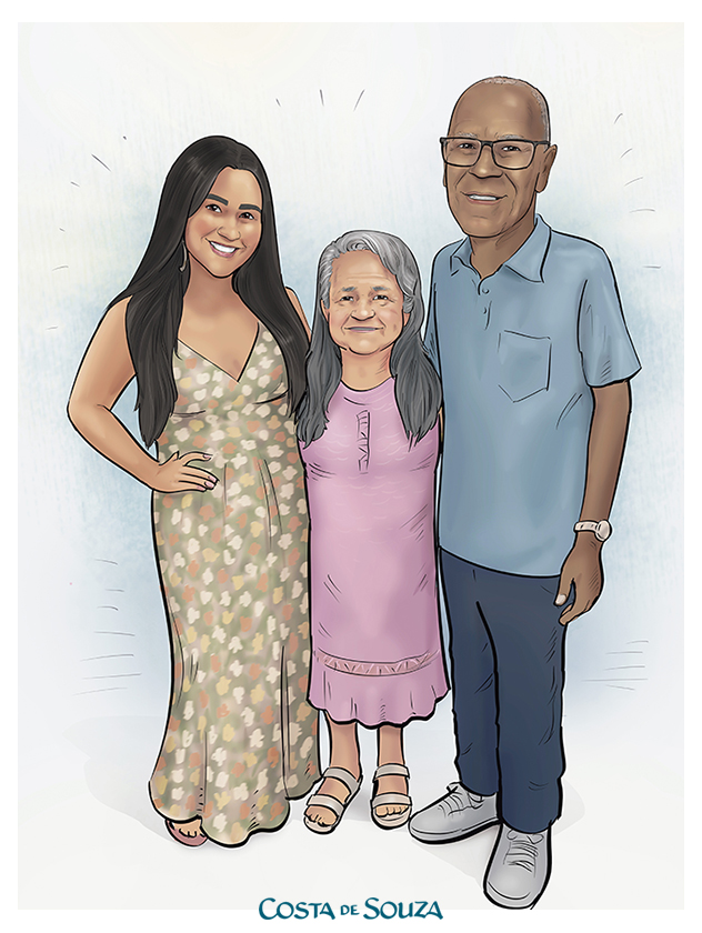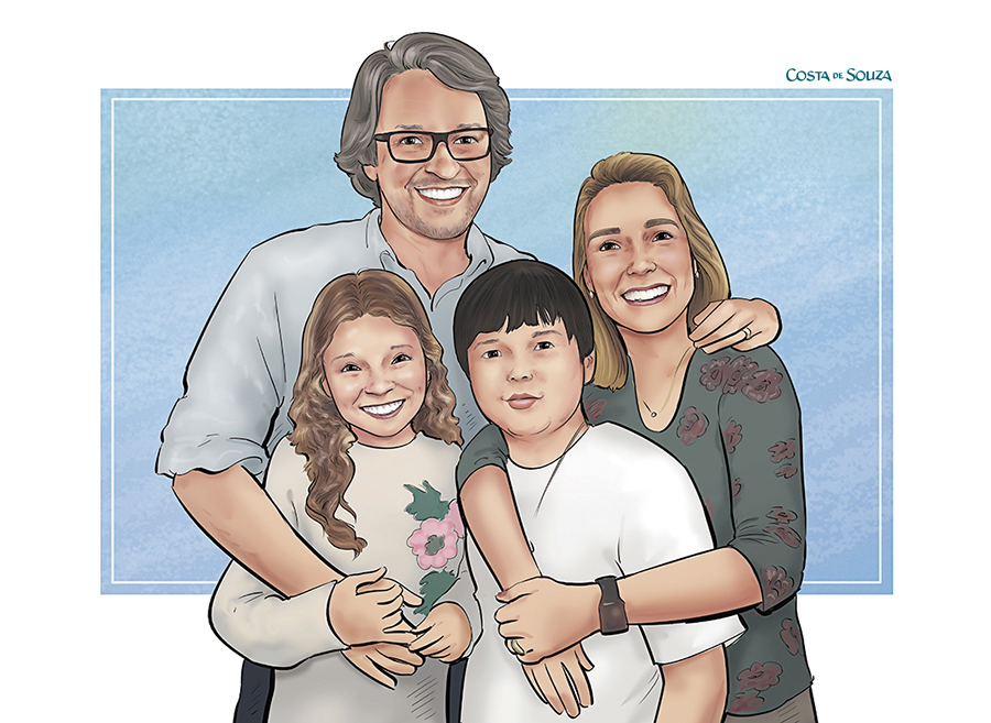 Caricatura de família por encomenda para quadro. Neste projeto, o cliente pediu que o desenho seguisse uma linguagem mais realista, para chegar a um resultado bem próximo da fotografia de referência.
