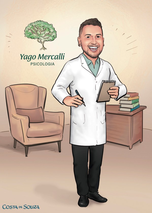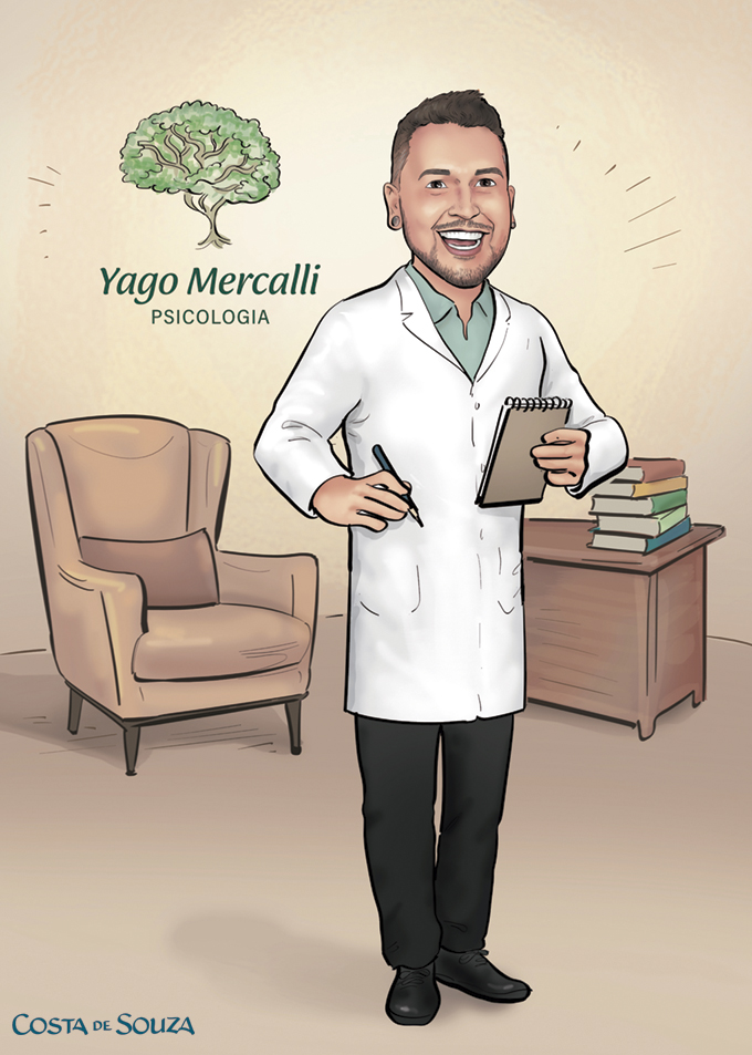 Caricatura para formatura de Psicologia. Formando com skate, videogame, ouvindo músicapelo celulare com uma estante com livros ao fundo. A caricatura foi um presente da namorada, que pediu para incluir corações no desenho e que o formando estivesse com a camisa do Palmeiras e jaleco com o símbolo do curso.