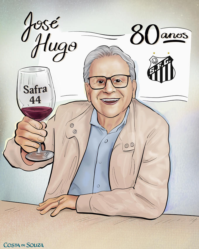 Caricature for an 80th birthday party, for a gift as a framed picture. The birthday man is a Santos FC fan and loves do drink wine. Commission. Colorful, “Complete Scene” option.